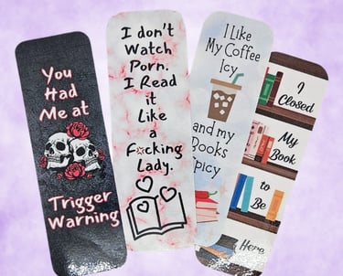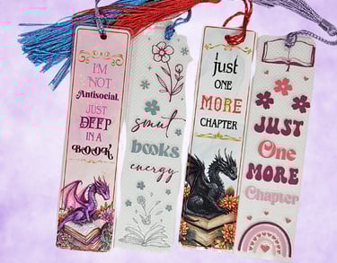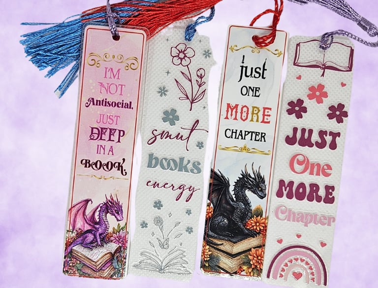 These are handmade bookmarks made by us here at Phoenix Creations. They have rounded corners and are in various styles.
